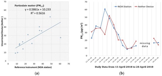 Subsequently, the reliability of the Aether was examined, all the individual measurements were checked and the validity of the data was evaluated by utilizing statistical metrics [42,43,44] in Table 1. “N”, refers to the number of data points (average hourly value) for each sensor. Its value comes from ratios derived from 1–2 s sampling times. For the evaluation process, the coefficient of determination (R2) for each data set was calculated, where array-1 was the worksheet range that holds the data of NOA station set and array-2 was the worksheet range that holds the Aether device data. The mean absolute error (MAE) was calculated in order to indicate the average magnitude of the errors. Mean bias error (MBE) quantifies the overall bias and detects whether Aether produces overestimation (MBE > 0) or underestimation (MBE < 0); and, finally, the root mean square error (RMSE) was calculated for the two data sets in order to aggregate them into a single measure of predictive power [45,46]. Final steps concerned the evaluation of the results in relation to their correlation and statistical analysis.