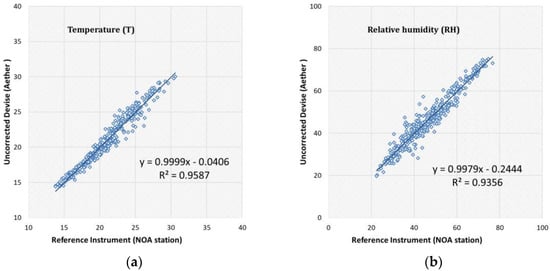 Finally, the comparison of air temperature and relative humidity measurements (Figure 6) was conducted with data completeness of 100%. The Aether device showed high correlations with the NOA station with R2 = 0.959 and R2 = 0.936, respectively, almost excellent slope and intercept, for both temperature and humidity, along with low values of MAE, MBE and RMSE (Table 1).