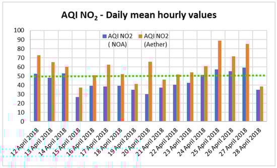 AQI daily values for NO2 according to NOA monitoring station and Aether device measurements. The green dot line represents the threshold value AQI = 50.