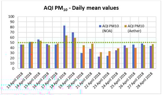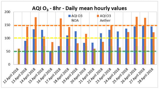 Correlations between ozone and each particulate component are considered to be weak and, according to previous research, this situation varies by season and location [59,60]. Rapid meteorological fluctuations affecting air pollution formation, especially in rather extreme events (like the Sahara dust event) along with ozone, produced by photochemical reactions over large spatial scales, can and may promote ozone formation and modulation, due to higher levels of primary pollutants, higher temperatures and different pressure conditions [61]. Therefore, although the Aether seems to always overestimate the value of AQI concerning O3, at these extreme weather conditions it appears not to follow the sharp increase and, in such cases, it should not be trusted. Concerning PM10, the comparison between daily AQI values derived via the Aether device and the corresponding values derived via the NOA monitoring station leads to very similar values (Figure 9). For 16 consecutive days the daily AQI value is lying (for both the Aether device and the NOA monitoring station) within the same health impact interval (100.0% success).