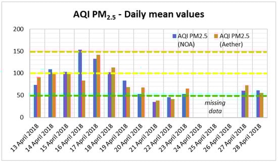 The same conclusions were derived for PM2.5. The comparison between daily AQI values derived via the Aether device and the corresponding values derived via the NOA monitoring station are almost identical (Figure 10). For 12 of the 13 consecutive days, the AQI daily value lies (for both the Aether device and the NOA monitoring station) within the same health impact interval (92.3% success). More specifically, for only 1 day the AQI value according to NOA was marginally larger than 150 (Unhealthy) and at the same time according to the Aether device was more than 50 and less than 100 (Unhealthy for Sensitive Groups).