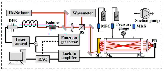 Experimental setup of WM-RE-OA-ICOS set-up. DFB: distributed feedback laser; BS: beam splitter; MFC: mass flow controller; PD: photodetector; DAQ: data acquisition card.
