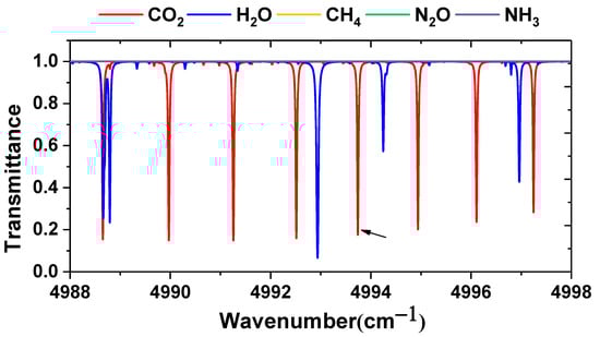 HITRAN simulation of the real atmosphere spectrum near 2 µm. Simulation conditions: temperature 296 K; pressure 90 Torr; absorption light path 407.4 m. (CH4 2 ppm, CO2 400 ppm, H2O 1.8%, N2O 320 ppb, NH3 20 ppb). The black arrow indicates the CO2 absorption line at 4993.7431 cm−1 selected during the measurement.