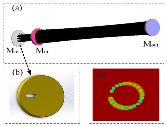 Reinjection structural parameter simulation: (a) light simulation of integral reinjection off-axis device; (b) reinjection mirror; (c) reflectional arrangement of light spots on the surface of the reinjection mirror.