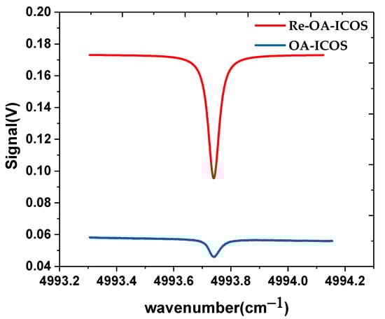 Absorption spectra were compared with or without reinjection systems. The red line is the RE-OA-ICOS absorption signal, the blue line is the OA-ICOS absorption signal; the RE-OA-ICOS signal strength is 6.3 times that of OA-ICOS.