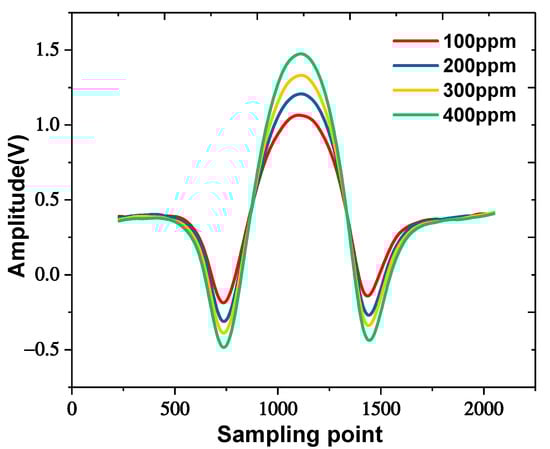 The 400 ppm CO2 and pure N2 were mixed into the CO2 sample gas with different concentrations of 100 ppm, 200 ppm, 300 ppm, and 400 ppm, respectively, by the mass flow controller (Sevenstar D07-7B). At the same room temperature of 23 °C and gas pressure of 90 Torr, the prepared sample gas was passed into the cavity, and a 2f signal was collected with the acquisition card for an average of 1000 times, as shown in Figure 6. The higher the concentration of sample gas, the greater the amplitude of the 2f signal.