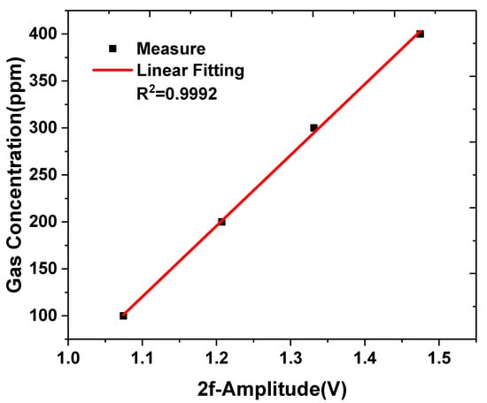 According to Equation (13), there is a linear relationship between gas concentration and 2f signal amplitude, and the fitting results are shown in Figure 7. The fitting results verified the theoretical linear relationship and prove the effectiveness of the system. The fitting curve is