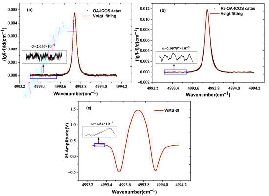 The experimental results showed that the RE-OA-ICOS (Figure 8b) improved the system sensitivity compared with the OA-ICOS (Figure 8a), and the SNR increased from 179 to 573. After adding the WMS, the SNR of the WM-RE-OA-ICOS (Figure 8c) was 1288, which was obtained by calculating the ratio of the peak-to-peak value and the standard deviation of the 2f signal, which is 7.2 times higher than that of the OA-ICOS and further improves the detection sensitivity of the system. Therefore, the WM-RE-OA-ICOS system possesses better performance.
