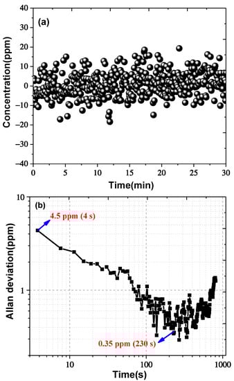 The WM-RE-OA-ICOS device was built to measure CO2 in the room environment for a long time. Before the measurement, the system stability time and detection limit were tested. Pure N2 was injected into the cavity, the flow rate was controlled to 80 SCCM/min, the pressure inside the cavity was 90 Torr, and the temperature was kept at 23 °C. The continuous measurement was performed for 30 min, with 50 times of average times for each dataset, and the average time was 4 s, as shown in Figure 9a. The total variation range of the measured concentration was from ~10 ppm to 20 ppm for a 30 min measurement time. The 2f signal amplitude was extracted and substituted into Equation (14) to get the measured gas concentration, and the Allan variance of the system was calculated, as shown in Figure 9b. The detection limit of the system was 4.5 ppm when the averaging time was 4 s, and the minimum detectable concentration (MDC) was 0.35 ppm at an integration time of 230 s.