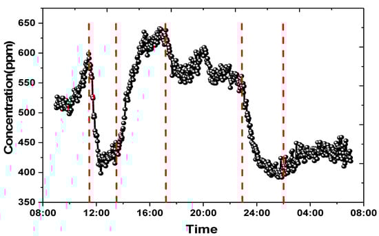 The variation of indoor CO2 concentration is measured by the device over time. Continuous measurement for 22 h. The red vertical line marks several representative time nodes. There is a large turnover of people nearby, and CO2 changes significantly.