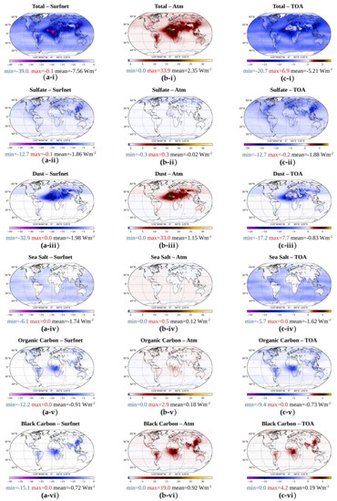 Mean annual (1980–2019) global distribution of aerosol Direct Radiative Effects: (a) at the Earth’s surface, (b) within the Atmosphere and (c) at the Top of the Atmosphere. (i) total aerosol load, (ii) sulfate, (iii) dust, (iv) sea salt, (v) organic carbon and (vi) black carbon particles.