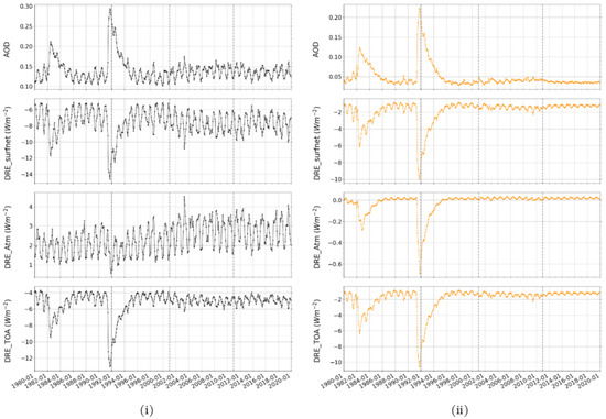 The Pinatubo eruption has a spurious decreasing effect on the MERRA-2 dust and sea salt AODs and DREs (Figure 4iii,iv). This artifact is induced by the large negative AOD increments applied in MERRA-2, which affect all aerosol species [51]. The reason was identified as the overestimation of sulfate AOD directly after the Pinatubo eruption, caused by MERRA-2 parameterization errors, such as the overestimation of Pinatubo injection altitude [108]. Apart from this abrupt decrease in the sea salt and dust load after the Pinatubo eruption, it is evident that the respective AODs are more pronounced during the second half of our study period compared to the first half. These changes are however much smaller than those of sulfate AOD. More specifically, the dust AOD ranged generally between 0.01–0.04 before 2000 while afterwards it increased to 0.015–0.050, also exhibiting a larger month-to-month variability. The sea salt AOD generally ranged between 0.030–0.044 and 0.037–0.048 during the same time periods. The changes in the dust load resulted in an increase in both dust surface cooling and atmospheric warming after 2000, with DREsurfnet and DREatm reaching in some cases values as high as −4.0 and 2.4 Wm−2, respectively. At TOA, desert dust induced a planetary cooling of 0.25–1.50 Wm−2 before 2000 and 0.50–1.75 Wm−2 afterwards. On the other hand, sea salt particles induced a similar surface and TOA cooling, which was slightly larger during the 2000s and 2010s (up to 2.0–2.3 Wm−2) compared to the 1980s and 1990s (surface and TOA cooling less than 2.0 Wm−2). The sea salt effect within the atmosphere also exhibited a small increase over these years; however, due to the non-absorbing nature of these particles, the induced atmospheric warming is small (Section 3.1). It should be noted that these results must be treated with caution because, besides the spurious post-Pinatubo dust and sea salt decrease, there are some other suspicious AOD “jumps”, e.g., between the late 90s and early 2000s, which can be possibly attributed to MERRA-2 observing system changes. As already discussed, MERRA-2 aerosol data are more reliable and consistent after 2000, when EOS data are assimilated.
