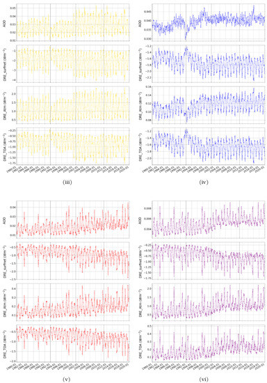 The time series (1980–2019) of monthly globally averaged MERRA-2 AOD and DREs at the Earth’s surface, within the atmosphere and at ΤOA, for sulfate, dust, sea salt, organic and black carbon particles, as well as for the total aerosol load, are presented in Figure 4 (note the different y-axis scales used in the different plots). The dashed vertical lines denote the transition dates between the four separate MERRA-2 production streams [50]. The results reveal that there are no discontinuities in AOD and DREs time-series across consecutive streams. Moreover, in Table S1 (Supplement) we provide the decadal annual mean aerosol DREs and AOD, spatially averaged over the globe, the North and South Hemispheres, global land and global ocean areas, as well as over the five selected world regions shown in Figure 3, which are representative of the various aerosol types and regimes, in order to provide some insight about their temporal variability.