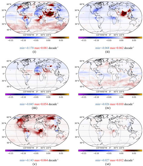 Slopes of deseasonalized MERRA-2 Optical Depth anomalies at the wavelength of 550 nm, over the period 2001–2019, for: (i) total aerosol load, (ii) sulfate, (iii) dust, (iv) sea salt, (v) organic carbon and (vi) black carbon particles. Units are decade−1.