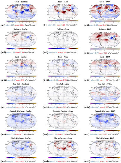 The long-term (1980–2019) globally averaged AODs and DREs (all components) per particle type are presented in Table 2, aiming to provide an overall picture of their contribution to the total aerosol effects. In the same table, we also provide the respective aerosol radiative forcing efficiencies (ARFE, i.e., the aerosol effects per unit optical depth, in Wm−2) which quantify the warming/cooling potential of each aerosol type. According to Table 2, the light-absorbing particles (i.e., black carbon and dust) are characterized by stronger forcing efficiencies compared to the scattering ones (sea salt and sulfate), either on the surface or in the atmosphere of the Earth. The strongest ARFEs are observed for black carbon particles, followed by desert dust and the lowest for sulfate and sea salt. The dependence of the ARFEs’ magnitude on the particle absorptivity is much more pronounced within the atmosphere compared to the surface. Characteristically, on the Earth’s surface, the ARFE of black carbon particles (the most light-absorbing type) is approximately three to four times larger than of sea salt and sulfate, while within the atmosphere they differ by two to three orders of magnitude. Since the atmospheric heating is directly proportional to the particle absorptivity, the effects of almost purely scattering particles are very small. On the other hand, scattering particles are largely forward-scattering, which reduces their surface cooling potential and results in a smaller ARFE compared to absorbing particles. These results depict very well the importance of the accurate determination of the aerosol absorptivity (i.e., the Single Scattering Albedo or SSA), especially for high AODs [97]. However, this parameter is one of the most difficult to retrieve using satellite remote sensing [99], inducing therefore significant uncertainties on the determination of the aerosol effects.