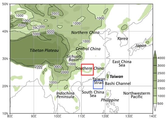 A map and topography (m, color) in East Asia. The red box (24°–28° N, 110°–115° E) shows the region to compute pressure fall and its related diagnosis, and the blue box (19°–22° N, 115°–119° E) is the region to compute mean flow upstream of Taiwan.