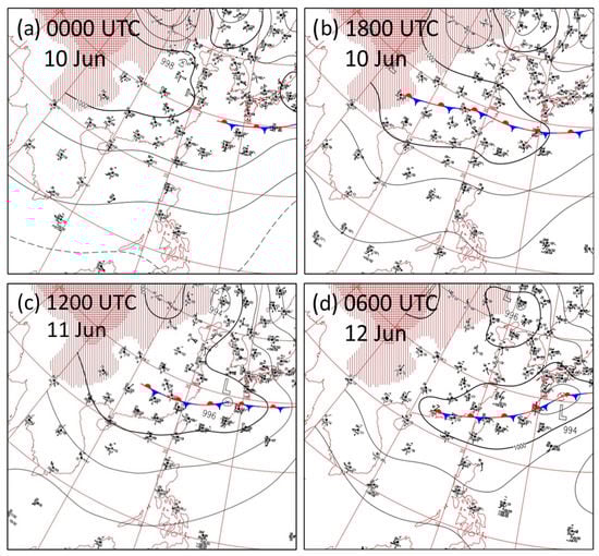 The JMA surface weather map at (a) 0000 UTC 10, (b) 1800 UTC 10, (c) 1200 UTC 11, and (d) 0600 UTC 12 June 2012, respectively. The Mei-yu front is depicted as stationary.