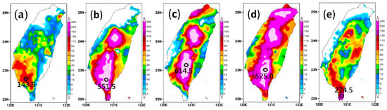 Daily rainfall distribution (mm; 0000-2400 UTC) from the gauge network in Taiwan on (a) 9, (b) 10, (c) 11, (d) 12, and (e) 13 June 2012. The location and value of daily maximum in each panel are marked.