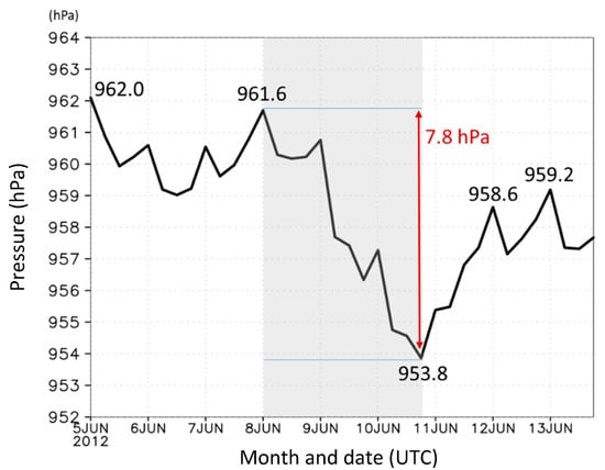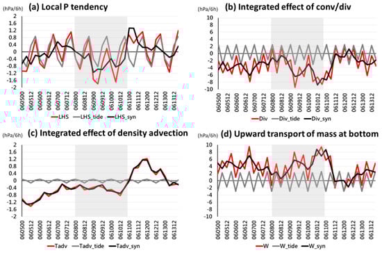 It is well-known that the semi-diurnal pressure tide is quite pronounced in subtropical regions such as South China, so its effects need to be removed from the terms in Equation (1) in order to reveal the signals at longer time scales. For this purpose, ERA-Interim data over a longer period from 0000 UTC 5 to 1800 UTC 16 June 2012 (12 days) are averaged to obtain the mean and averaged departures from this mean at each time of 0000, 0600, 1200, and 1800 UTC, respectively. Then, these departure values are subtracted from the original time series data based on the local time to remove the semi-diurnal tide. In cases where diurnal variations, instead of semi-diurnal ones, need to be removed (not limited to p), the same procedure is used.