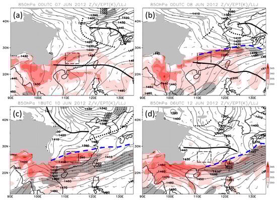 The geopotential height (gpm, contours, every 10 gpm), horizontal winds (barbs, full barb = 10 kt), equivalent potential temperature (θe, K, color), and the location of LLJ exceeding 12.5 m s−1 (stippled) at 850 hPa at (a) 0000 UTC 7, (b) 0000 UTC 8, (c) 1800 UTC 10, and (d) 0600 UTC 12 June 2012 in the ERA-Interim analysis. The ridge (thick solid line), trough (dotted line), and surface frontal location (in JMA charts; blue dashed line) are marked. Gray shades indicate the topography higher than 1500 m, and the box for average in South China is also plotted (dashed box).