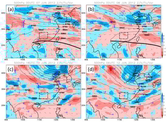 The geopotential height (gpm, contours, every 30 gpm), horizontal winds (barbs, full barb = 10 kt), virtual temperature (θv, °C, red dotted isotherms with blue labels), and relative vorticity (10−5 s−1, color, scale to the right) at 500 hPa at (a) 0000 UTC 7, (b) 0000 UTC 8, (c) 1800 UTC 10, and (d) 0600 UTC 12 June 2012 in the ERA-Interim analysis. The ridge (thick solid line) and trough (dotted line) are marked where needed, and the box for average in South China is also plotted (dashed box).