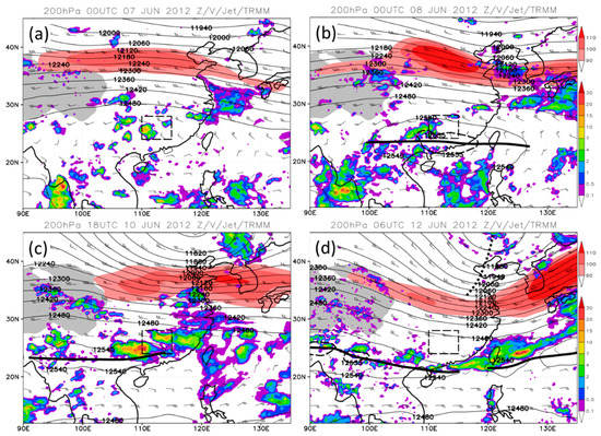 The geopotential height (gpm, contours, every 60 gpm), horizontal winds (barbs, full barb = 10 kt), and upper-level jet in excess of 90 kts (color, scale to upper right) at 200 hPa in the ERA-Interim analysis, overlaid with TRMM rainrate (mm h−1, color, scale to lower right) at (a) 0000 UTC 7, (b) 0000 UTC 8, (c) 1800 UTC 10, and (d) 0600 UTC 12 June 2012. The ridge (thick solid line) and trough (dotted line) are marked where needed. Gray shades indicate the topography higher than 3000 m, and the box for average in South China is also plotted (dashed box).