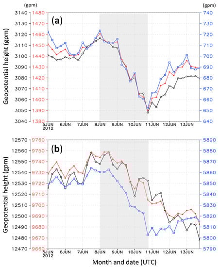 In Figure 8, the time series of areal-averaged geopotential height over the same box in South China (as used for Figure 4) at several different p-levels from the lower to upper troposphere are shown. First, at 925 hPa (blue, Figure 8a), the curve has a tendency very similar to that of surface p in Figure 4, as expected since the two levels are close to each other. The drop in geopotential height at the 925 hPa level from 0000 UTC 8 to 1800 UTC 10 June (shaded background) is over 70 gpm. Comparable values are also obtained for the 850 (red) and 700 hPa levels (black), with some increase before 8 June and a certain level of rebound on and after 11 June. At 500 hPa (blue, Figure 8b), a decrease of nearly 60 gpm was observed during the pressure drop period, but only about 40 and less than 20 gpm at 300 and 200 hPa, respectively. At 150 hPa, the drop was only 9.95 gpm, fitted to be the top level for integration in Equation (1). This result indicates that the pressure drop (or equivalently, height drop of p-levels) in South China in the present case occurred through deep layers, and was not limited to only the lower troposphere. After 1800 UTC 10 June, some recovery in geopotential height also took place at 500 hPa, but the values continued to decrease in upper levels at 300 and 200 hPa (Figure 8b).