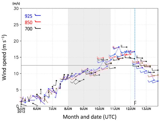 The time series of horizontal winds (m s−1, barbs, full barb = 10 m s−1) in the ERA-Interim analysis at 925 (blue), 850 (red), and 700 hPa (black), respectively, averaged inside the blue box in Figure 1 in the upstream area of Taiwan, from 0000 UTC 5 to 1800 UTC 13 June 2012. The symbol “F” marks the time when the surface front reached northern Taiwan.