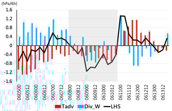 Since the column-integrated effect of convergence and vertical motion term were nearly opposite to each other, it is not ideal to examine them separately because it is difficult to tell which term had a slightly stronger effect and exceeded the other one. Therefore, the sum of these two terms are plotted in Figure 11 (blue bars, with semi-diurnal signals removed) and compared with the synoptic signals of the tendency (black curve) and temperature advection (red bars) terms. In this figure, the tendency term is the difference of the other two terms, since Equation (1) is now reduced to a total of only three terms. It is seen that the net dynamical effect (convergence plus vertical motion) contributed to pressure fall near the surface in South China mainly during the entire day of 9 June, with values of about −0.7 hPa per 6 h from 0000 to 1200 UTC. At other times during the pressure drop period, its contribution was nearly zero or slightly negative, and thus it was mainly the temperature advection term to cause the pressure fall (Figure 11). Before the drop period, the dynamical effect (toward p rise) counteracted the thermal advection effect (toward p fall, also cf. Figure 10c), and was weaker than the latter before but stronger after 1800 UTC 6 June. Thus, slight p drop occurred before 1800 UTC 6 June and recovered afterwards in both Figure 4 and Figure 11. During the rebound period on 11 June, the dynamical term also contributed more toward the pressure rise than the thermal advection term, but the other way around later on toward and during 12 June. In summary, the temperature advection term contributed positively toward pressure fall both before and during the pressure fall period, although it was weaker in the latter period. The dynamic term, on the other hand, changed from positive prior to the fall period to near zero to negative values during the fall period, and thus also contributed toward the pressure fall, particularly on 9 June (on the second day of the fall period). As a result, the tendency term was also the most negative and the low-level pressure exhibited the largest drop on 9 June (Figure 4, Figure 8a, and Figure 11).