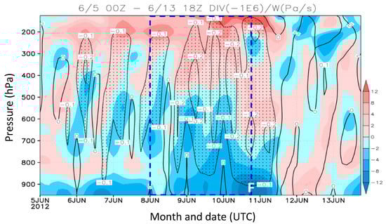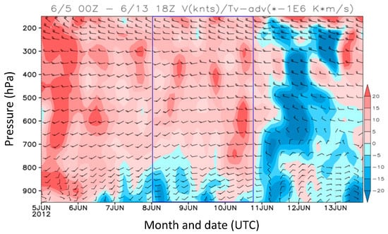 From Figure 11, it is seen that the entire column over South China exhibited positive net thermal advection, i.e., warm air advection, to contribute toward the pressure fall for a lengthy period from 5 to 10 June 2012 (six days). To further understand the more detailed structure and distribution of this thermal effect, the time-height vertical cross-section of the horizontal advection of virtual temperature (Tv), again averaged over the red box in Figure 1, is constructed and shown in Figure 12. Here, virtual temperature is used because it includes the effect of water vapor on air density and thus is better tied to density advection compared to temperature alone. In Figure 12, one can see that before and during the pressure drop period, from 0000 UTC 5 to 1800 UTC 10 June, warm air advection existed throughout more or less the entire troposphere in South China, as the prevailing flow there was mainly southwesterly to westerly. Near the surface and at low levels, however, some cold air advection appeared from 1200 UTC 6 to 10 June, with a maximum depth to about 750 hPa on 8 June (Figure 12). The warm air advection was the strongest on 5 June, over 2 × 10−5 K s−1 through much of the troposphere, before the pressure fall period. During the fall period, the warm air advection became weaker and the near-surface cold air advection also counteracted part of its warming effect, and therefore the net contribution decreased but still toward pressure fall (cf. Figure 11). After the pressure fall in South China had ended at 1800 UTC 10 June, the Mei-yu front moved south and the low-level southwesterly winds were replaced by northerly winds behind the front (also cf. Figure 5d), while the flow further aloft also turned into stronger northwesterly (cf. Figure 6d and Figure 7d), cold air advection appeared during 11–13 June throughout much of the troposphere in South China instead. This contributed toward the pressure rise (rebound) after the drop period. The virtual temperature advection in Figure 12 can be separated into two components by geostrophic wind and ageostrophic wind, and it turned out that the former component was consistently the primary one, and the ageostrophic winds were weak and had only minor effect in thermal advection (figure not shown). In other words, before and during the pressure drop period, the persistent west-southwesterly to westerly flow, largely in geostrophic balance, in the southern portion of the confluence pattern in South China advected warmer air from lower latitudes and thus contributed toward the pressure drop.
