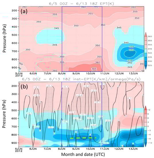Before the dynamic terms including the convergence and vertical motion effects are further discussed, it is appropriate to first examine the thermodynamic structure and stability of the atmosphere in South China. Figure 13a shows the time-height vertical cross-sections of θe in South China (averaged over the red box in Figure 1). As seen, the spatially averaged θe values were lower in the mid-levels (near or below 345 K) and higher both at lower and upper levels. Such a structure is typical in the tropics and subtropics, and indicates potential or convective instability in the lower atmosphere (where θe decreases with height). In general agreement with the warm air advection, the θe values increased slowly through the deep layer from 5 to 10 June, and this increase was more evident below 600 hPa and could reach over 365 K near the surface on 10 June (Figure 13a). Afterwards, during the rebound period, θe rapidly decreased at lower and middle levels to produce a clear minimum center near 700 hPa, apparently due to the cold (and dry) advection at that time (cf. Figure 12).