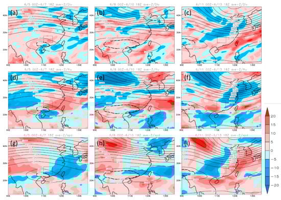 From the above discussion, the upper-level divergence was persistent both before and during the pressure drop period, and was also an important factor to the pressure fall besides the warm air advection, especially on 9 June. Thus, in Figure 15, the time-averaged flow and divergence patterns at 200 hPa before, during, and after the pressure fall period are presented to help diagnose the origin of the upper-level divergence. From 5–7 to 8–10 June, the center of the South Asian anticyclone was located near 105°–110° E, to the southwest or west-southwest of the rectangular box in South China, and was strengthening with increasing geopotential height values (Figure 15a,b). The area of the box in South China was inside the northeastern quadrant of the South Asian anticyclone and was dominated by strong upper-level divergence. After the pressure drop period, the South Asian anticyclone retreated westward and the divergence at 200 hPa weakened during 11–13 June (Figure 15c), when the mid-latitude trough also extended southward as discussed (cf. Figure 7d).