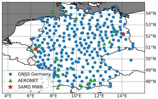 In order to validate this new algorithm and its product, we collected TCWV observations from several networks and ground-based stations which operated in Germany at the time of satellite observations. We performed a validation of the product against ground-based measurements of the Aerosol Robotic Network (AERONET), the Global Navigation Satellite System (GNSS) and several German microwave radiometric stations. The study domain and the positions of the used reference data sets are shown in Figure 1.