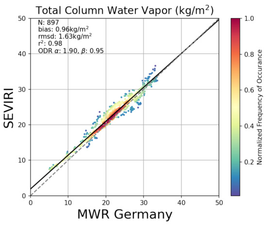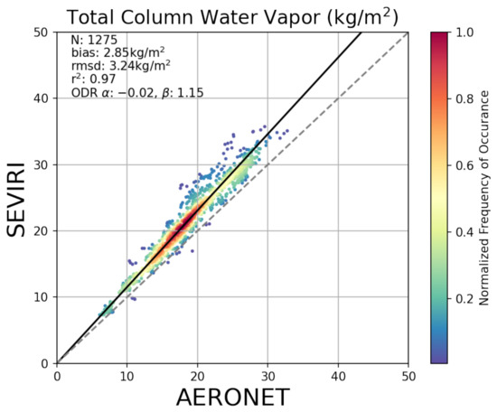 In total, there were 1275 match-ups for the AERONET reference with 30 available stations. The validation study shown in Figure 2 concluded with a wet bias of 2.85 kg/m, a rmsd of 3.24 kg/m and a Pearson correlation coefficient of 0.97. This wet bias is in correspondence with literature, since in comparison with other water vapour products, AERONET exhibits a dry bias [47]. The ODR yields an offset of −0.02 and a slope of 1.15. Overall, the products show good agreement.