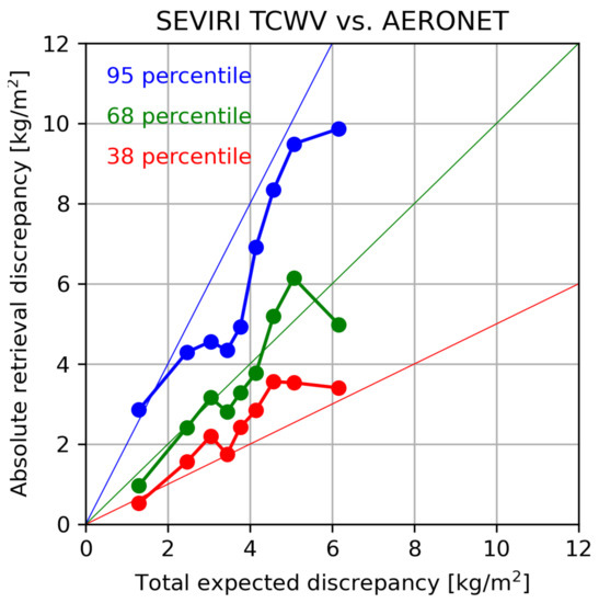 Comparison of observed, absolute discrepancy between SEVIRI TCWV and AERONET TCWV and the total expected error, computed from Equation (9).