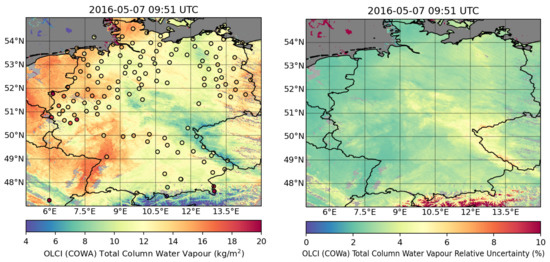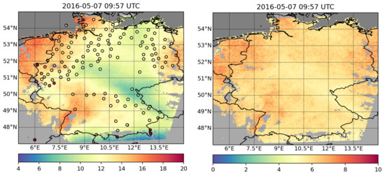 In Figure 5, SEVIRI TCWV and associated relative uncertainty over Germany on 7 May 2017 at 9:57 UTC is shown. The excerpt and plot’s design were directly adapted from [16] in correspondence with the authors. Overlaid in circles are the TCWV measurements of the GNSS Germany network available for this time step. Large scale variabilities with values ranging between 4 kg/m in the South and Southeast and 20 kg/m at the coast in the Northwest can be observed. Relative uncertainty lies in a range between 5 and 6% for lower TCWV and 6 to 8% for higher values.