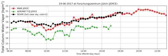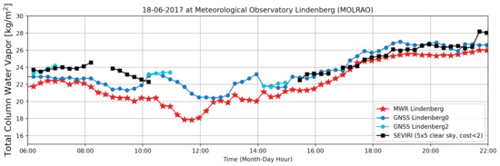 At several sites in Germany, ground-based microwave radiometers (MWR) are operated. The stations available for 2017 are the Jülich Observatory for Cloud Evolution (JOYCE) [53], the Meteorologisches Observatorium Lindenberg Richard-Aßmann-Observatorium (MOLRAO) and Umweltforschungsstation Schneefernerhaus (UFS). MWRs measure emitted radiation at several channels in the microwave spectrum within a narrow zenith looking angle. The measured brightness temperatures are used to retrieve TCWV via a multiple regression, which is developed for each site [54,55]. These instruments provide high-accuracy, high-temporally resolved water vapour estimates at any time of day and virtually any weather conditions given that the instrument is not covered with water. The temporal resolution is in the order of seconds and uncertainties are around 0.5–0.8 kg/m [56]. The data are provided by and were downloaded from the SAMD as well.