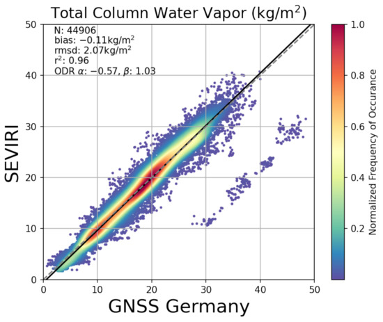 The GNSS network contains more stations than AERONET in Germany, there are 44,906 match-ups with 333 stations spread across the whole study domain. We observe a small dry bias of −0.11 kg/m, a rmsd of 2.07 kg/m and a of 0.96. The ODR indicates a very good agreement between SEVIRI and GNSS TCWV with a slope of 1.03 and an offset of −0.57.