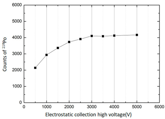 Figure 3 displays the result showing the relationship between the net counts of 218Po and high voltage. The result suggests that the counts of 218Po grow with the increase in high voltage and are nearly stable after 3000 V, which means that for the collection chamber of 16.8 L, 3000 V is near the saturated voltage.