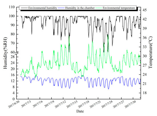 It can be observed that the temperature and relative humidity of the location environment vary are in the ranges of 22.8 °C~37.0 °C and 55.0%RH~100%RH, respectively. Inside the collection chamber, the relative humidity of sampling air is greatly reduced, which is varied in a limited range from 6.6%RH to 15.9%RH. More than 80% water vapor is removed by the dried air, and the dry effect is quite efficient, as expected in earlier calculations [28,29].