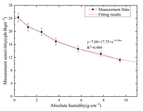 It can be observed that the measurement sensitivity declined from 24.3 cph/(Bq·m−3) to 11.2 cph/(Bq·m−3) with the increase in absolute humidity in the chamber from 0.34 g·m−3 to 9.47 g·m−3. It exhibited an obvious negative exponent relationship. The fitting results of the measurement data are also shown in Figure 5 with a correlation coefficient R2 of 0.989, following a previous equation [24].