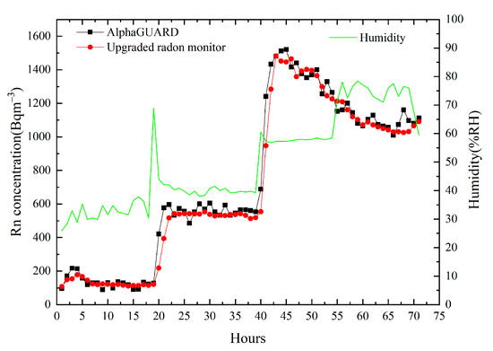 After humidity response correction, a comparison experiment was carried out in the radon chamber, where the radon concentration could be adjusted from nearly 100 Bq·m−3 to 1000 Bq·m−3, and the relative humidity could be adjusted from 30%RH to 80%RH with the temperature stable at 22 °C. The upgraded radon monitor was compared with an AlphaGUARD PQ2000 monitor. Comparison results with the relative humidity are shown in Figure 6.