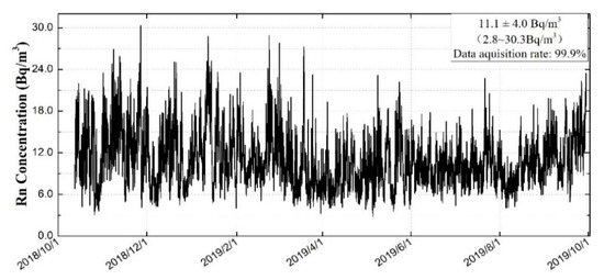 In order to verify the stability of the upgraded monitor, a one-year continuous measurement of atmospheric radon concentration was carried out by setting the upgraded radon monitor at a three-storied building platform, located in the campus of Peking University, Beijing (39.59° N, 116.19° E). The unattended field observation was performed between 15 October 2018 and 1 October 2019. The hourly measurement results are shown in Figure 7, with a data acquisition rate of more than 99.9%.