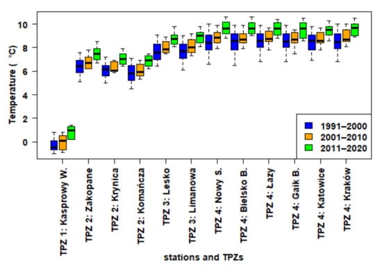Mean annual air temperature (°C, black horizontal marks inside the boxes) in specific decades at the stations studied. Boxes mark the first and the third quartile, and the whiskers show the highest and the lowest value in a certain decade. Standard errors for the mean values are provided in Appendix C. Stations are ordered following the concept of TPZ explained in Section 4.1.
