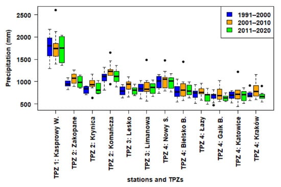 In the case of precipitation, there are no statistically significant changes for annual totals (according to regression analysis and the Mann–Kendall test; see Appendix B). The comparison of mean annual totals in specific decades confirms this fact (Figure 3); the highest values were noted in the second decade. The values of the variability coefficient for annual totals are below 25% which means low variability. However, the values for particular months reveal that for Kasprowy Wierch, Bielsko-Biała, Limanowa and Kraków, for all months the coefficient values are >45%, which means high variability. For Zakopane, Katowice, Łazy, Nowy Sącz, Gaik-Brezowa and Krynica, from 1 to 3 months show mean variability (25–45%) but for all other months, the coefficient exceeds 45%. For Lesko and Komańcza, 4–5 months show mean variability while all other months have high variability. Additionally, there is no clear dependency between precipitation and altitude (except Kasprowy Wierch) or precipitation and longitude, and this is linked to the strong local impacts of landforms in the mountains on spatial patterns of precipitation.