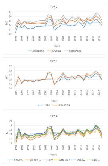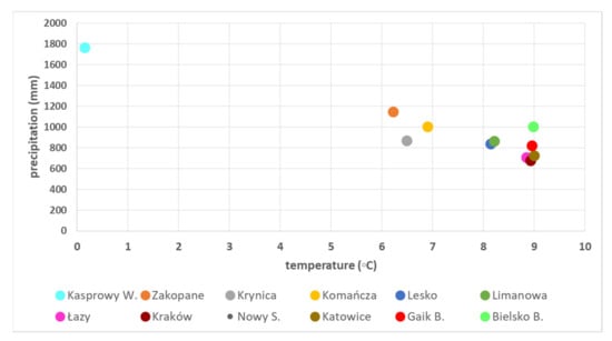 - TPZ 4: The Carpathian foreland and foothills, together with basins located about 200–400 m a.s.l., represented by Bielsko-Biała, Gaik-Brzezowa, Nowy Sącz, Łazy, Kraków and Katowice, where the mean annual air temperature is the highest in the vertical profile (8.9–9.0 °C), and annual precipitation totals are very diversified, from 670 to 1000 mm, so the potential drought risk is high.