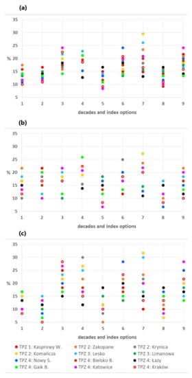 SPI values for the 1-month time scale vary from 3.74 to −4.28, for the 3-month scale from 3.81 to −3.13, and for the 6-month scale from 3.62 to −2.78. None of the SPI 1- and 3-monthly series shows any statistically significant trend; the results of the Mann–Kendall test are presented in Appendix B. In the case of SPI 6-monthly series for Zakopane, Krynica, Komańcza (TPZ 2) and Gaik-Brzezowa (TPZ 4), the p-values indicate statistically significant increasing trends, but Sen’s slope values are as low as 0.001, and low tau values indicate that the trends are weak (Appendix B). A 1-month SPI reflects short-term conditions, related closely to meteorological drought along with short-term soil moisture and crop stress, while a 3-month SPI reflects short- and medium-term moisture conditions and provides a seasonal estimate of precipitation, and a 6-month SPI indicates seasonal to medium-term trends in precipitation [39]. Figure 5 presents the data for the decades and it shows that in a short-term perspective, a clear increase in the frequency of dry months in the cold subperiod can be seen in the last decade in comparison to the previous ones (except Gaik-Brzezowa; Figure 5c). This is also the reason for the increase of dry-month frequency at an annual scale (Figure 5a). The increase is observed throughout the whole study area. In the decade 2011–2020, the frequency of dry months according to SPI reached about 15% on an annual scale at all stations. For medium-term and seasonal perspectives (Figure 5, data for 3- and 6-monthly timescales), there are no clear spatial or temporal patterns.