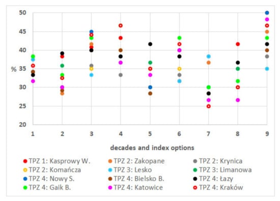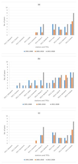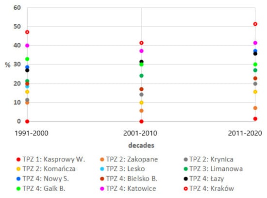 The Selianinov index could be calculated for all stations (except Kasprowy Wierch) and for each year only for June, July and August; for other months the values could be calculated only sporadically. The Mann–Kendall test for those three months showed no statistically significant trend at any station. All p-values exceeded 0.05, tau values varied from −0.159 to 0.062. However, the Selianinov index, unlike SPI and RPI, showed a large spatial variability of drought occurrence in the warm part of the year (Figure 7), with a clear increase in drought risk with decrease in altitude (i.e., from less than 10% of dry months at Kasprowy Wierch (TPZ 1) to over 50% in Kraków, TPZ 4). Additionally, the data show that for most stations, the share of dry months is greater in the last decade than in the two previous ones. An increase is especially visible in the highest parts of the Carpathians. Until 2015, the Selianinov index could be calculated for Kasprowy Wierch only once over several years, and only for July, while later it could be calculated also for June and August, as the index is calculated only for the months when the mean daily air temperature exceeds 10 °C. There is no significant difference in the W-E profile concerning drought risk, but the data for Bielsko-Biała are worth attention as the risk is much lower than in other stations of similar locations. Bielsko-Biała and Katowice (TPZ 4) are the westernmost points of the study area, and both of them are exposed to moist oceanic air masses coming from the west; however, Bielsko-Biała is located in the Carpathian foothills, that is, close to an orographic barrier which enhances precipitation. Figure 3 shows that Bielsko-Biała has higher precipitation sums than neighboring stations.