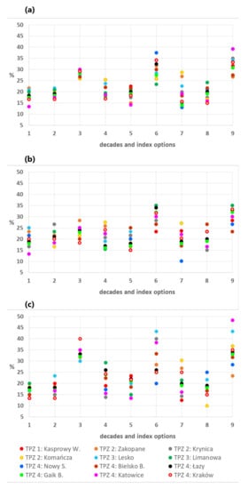 Percentages of dry months according to SPI (SPI ≤ −1.0) for 1-, 3- and 6-monthly timescales, for the whole year (a) and for the subperiods May–October (b) and November–April (c) in the decades of the study period. Stations are ordered following the concept of TPZ explained in Section 4.1. Explanation of numbers on axis x: 1—1991–2000, 1 month; 2—2001–2010, 1 month; 3—2011–2020, 1 month; 4—1991–2000, 3 months; 5—2001–2010, 3 months; 6—2011–2020, 3 months; 7—1991–2000, 6 months; 8—2001–2010, 6 months; 9—2011–2020, 6 months.