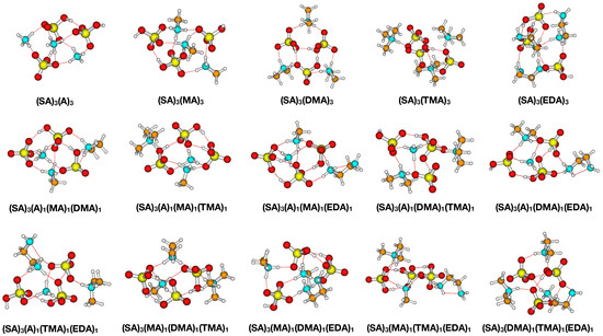 The stability of the remaining mixed clusters have the following ranking in the binding free energies (in kcal mol): (MA)(DMA)(TMA) (−70.7) < (MA)(TMA)(EDA) (−71.0) < (DMA)(TMA)(EDA) (−72.2) < (MA)(DMA)(EDA) (−73.3). All four clusters are relatively close in stability, but some trends are possible to deduce. Again, having both DMA and EDA in the cluster leads to the highest stability. Similarly, having TMA present generally leads to a slight decrease in the stability. The high stability when having both DMA and EDA present in sulfuric acid clusters was also observed previously for the smaller (SA)(DMA)(EDA) clusters [45]. This is consistent with the calculated free energies in Table 1. For instance, it is seen that the clusters that consist of both DMA and EDA are in all cases some of the most stable ones. Overall, it is still found that DMA leads to the most stable clusters. While the calculated free energies are lower at lower temperatures, the above stability rankings were generally found to be independent of whether the free energy was calculated at 298.15 K or 218.15 K.